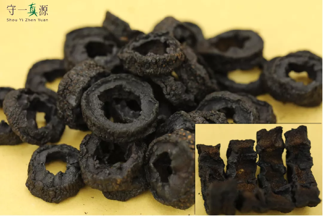 新货外皮红色,果肉深黄色至浅棕色;陈货果肉深棕色至褐色。